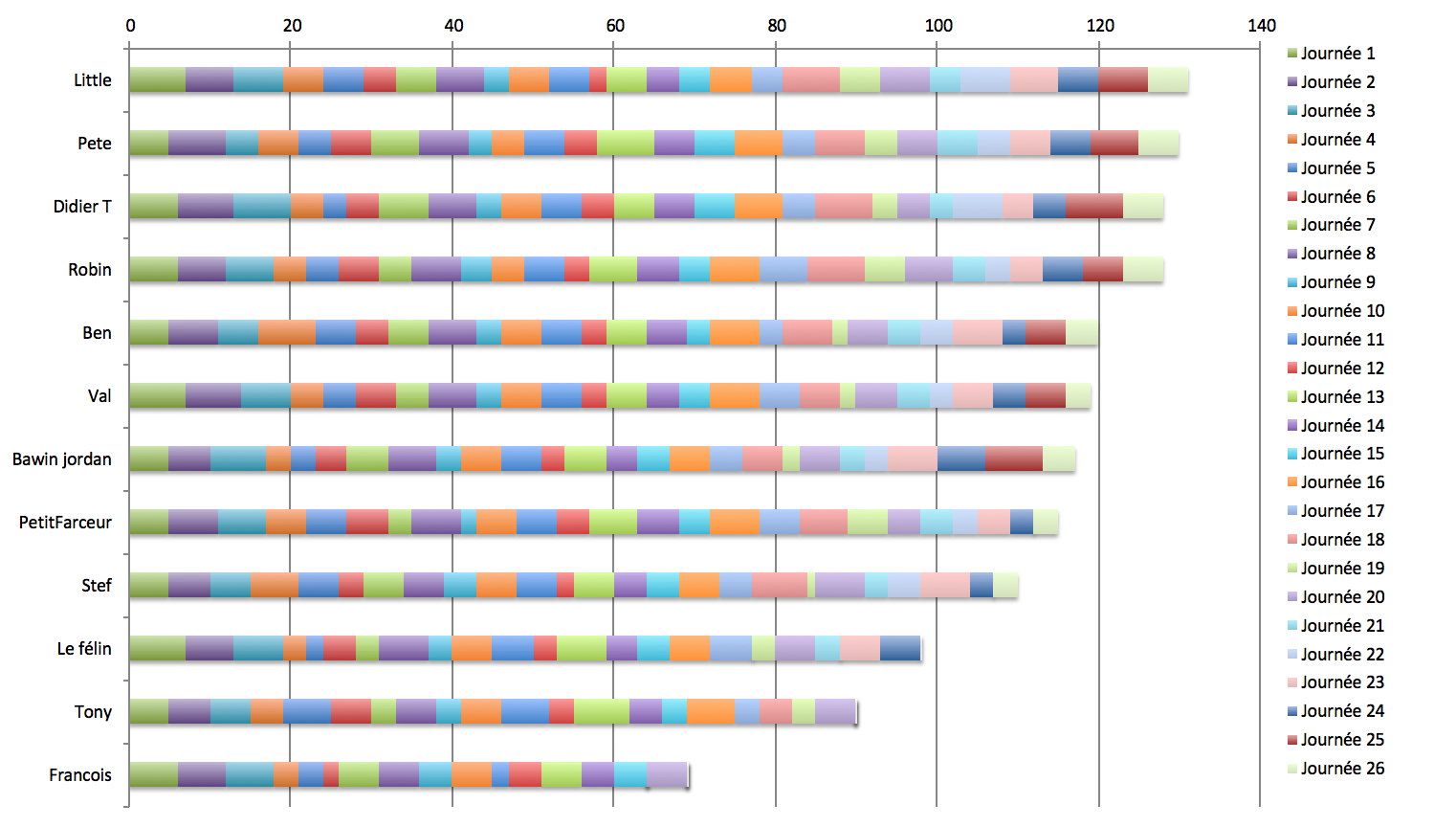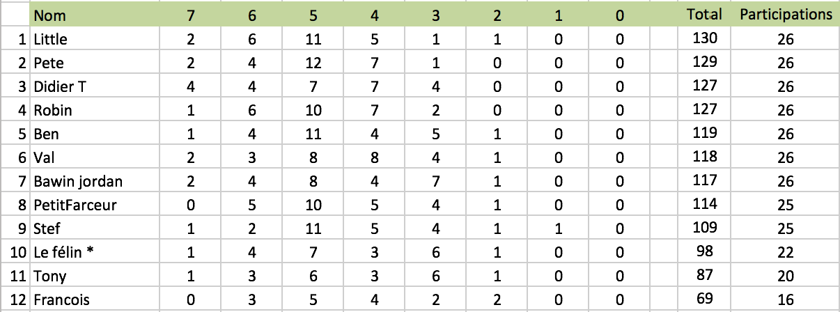 Le Classement Classement Final L’évolution des résultats Classement de la 26e journée: Cornet robin 5 DidierT 5 Little 5 Pete 5 Bawin jordan 4 Ben 4 Petit farceur 3 Stef 3 Val 3 Dernière mise à jour le 26 Avril 2015 Partager :Tweet Cliquer pour envoyer un lien par e-mail à un ami(ouvre dans une nouvelle fenêtre) E-mail Plus Cliquer pour imprimer(ouvre dans une nouvelle fenêtre) Imprimer PocketPartager sur Tumblr